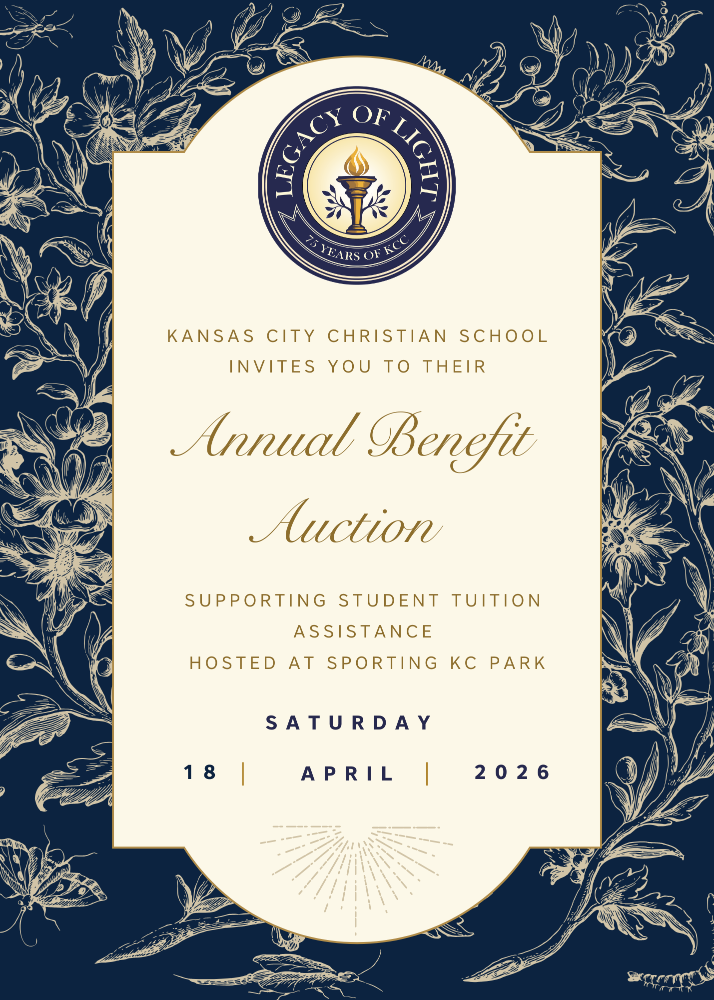 Kansas City Christian School warmly invites our community to join us for the Annual Benefit Auction on Saturday, April 18, 2026, at Sporting KC Park. This special evening celebrates 75 years of KCC and supports student tuition assistance, helping make a Christ-centered education accessible to more families. Guests will enjoy a memorable night of fellowship, generosity, and celebration as we come together to invest in the lives and futures of KCC students. We look forward to sharing this meaningful evening with you as we continue the legacy of light at KCC. ✨